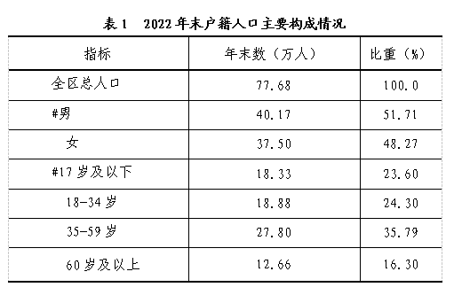 年末全区户籍总人口为77.68万人,其中城镇人口28.74万人,乡村人口48.93万人。全年出生人口6280人,死亡人口3765人。年末常住人口82.96万人,其中城镇常住人口50.51万人,乡村常住人口32.45万人,常住人口城镇化率为60.89%。人口出生率6.8‰,死亡率6.65‰,自然增长率0.15‰。