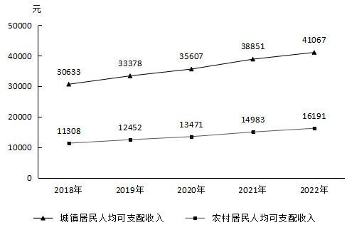 全年城镇居民人均可支配收入41067元,比上年增长5.7%;农村居民人均可支配收入16191元,增长8.1%。城乡居民收入比为2.54,比上年下降0.05。城镇居民人均消费支出19538元,增长7.4%;农村居民人均消费支出16271元,增长8.2%。城镇居民家庭恩格尔系数25.6%,下降5.6个百分点;农村居民家庭恩格尔系数29.4%,下降2.7个百分点。