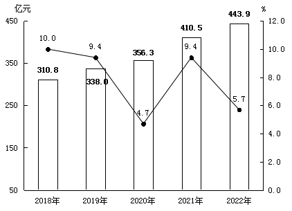 初步核算,2022年全区实现地区生产总值443.90亿元,按不变价格计算,比上年增长5.7%。其中,第一产业增加值28.17亿元,增长4.3%;第二产业增加值193.17亿元,增长7.0%;第三产业增加值222.56亿元,增长4.8%。三次产业结构比由上年的6.5:43.2:50.3调整为6.4:43.5:50.1,三次产业的贡献率分别为5.3%、51.5%和43.2%。人均地区生产总值53547元,增长5.5%。非公有制经济实现增加值295.48亿元,增长6.3%,占GDP的比重为66.6%,比上年提高0.1个百分点。