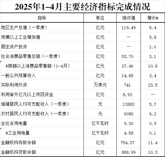 2025年1-4月主要经济指标完成情况
