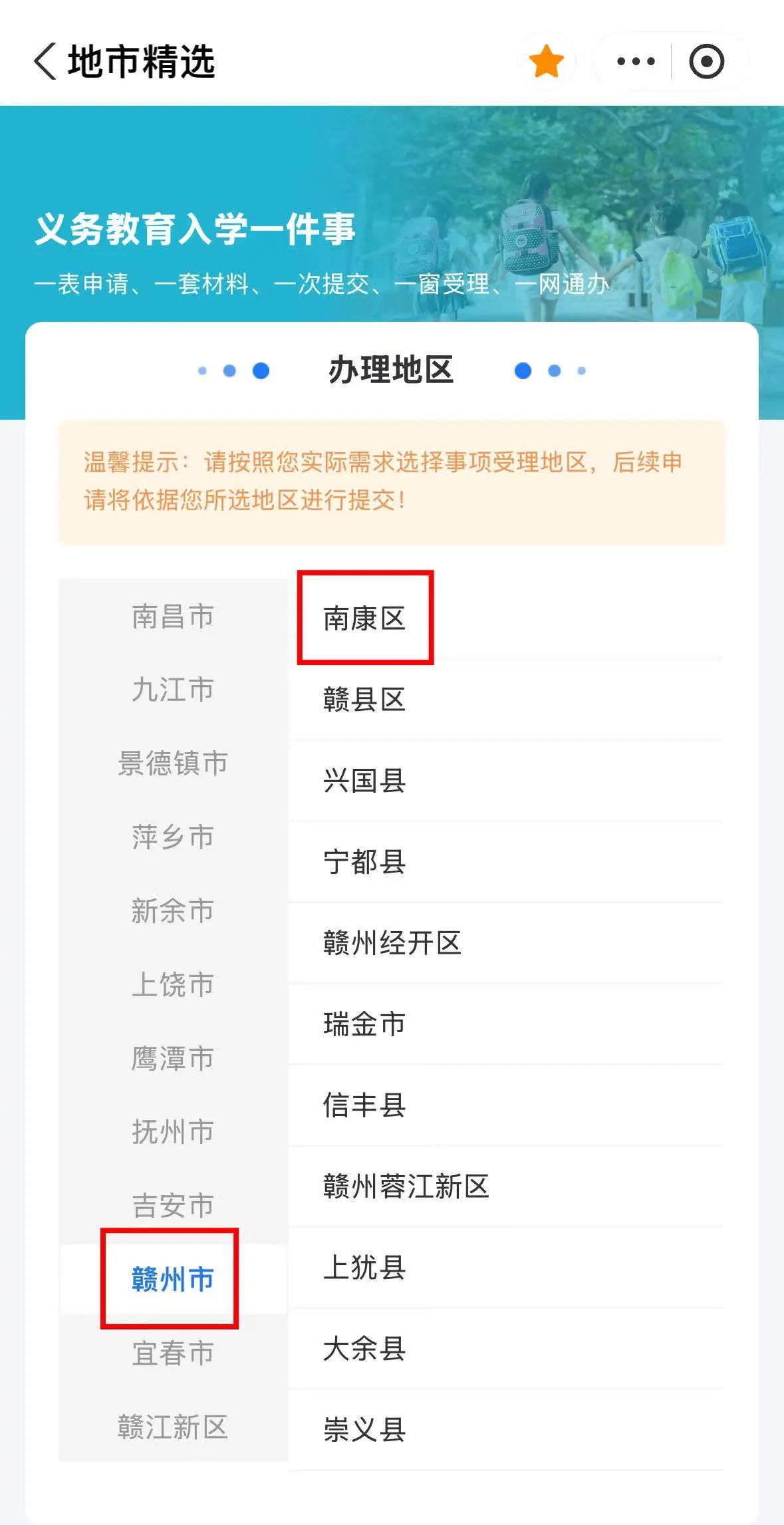 4.打开支付宝“赣服通”小程序-搜索进入“义务教育入学一件事”—办理地区依次选择赣州市及南康区,进入报名系统。