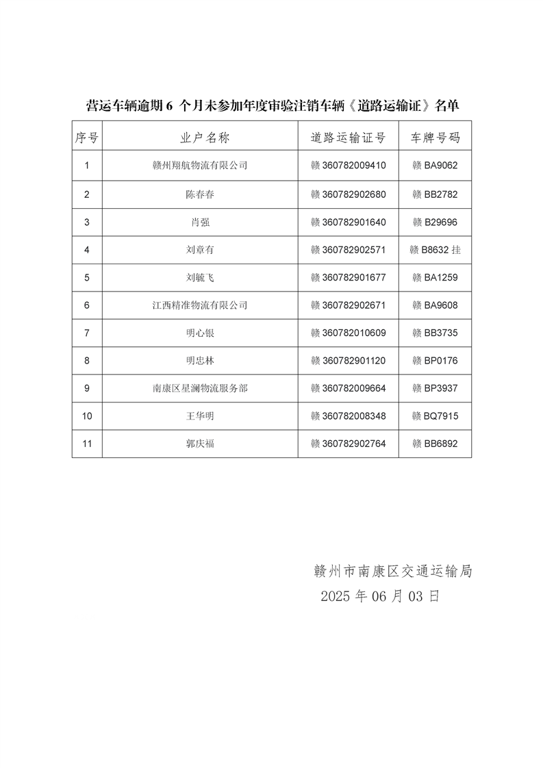 南康区营运车辆逾期6个月未参加年度审验注销车辆《公路运输证》公告(2025年6月3日)