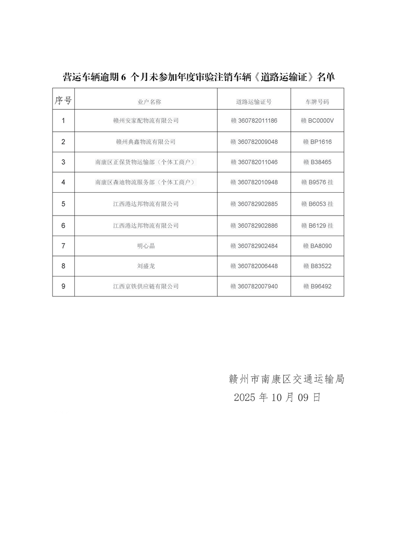 南康区营运车辆逾期6个月未参加年度审验注销车辆《公路运输证》公告(2025年10月9日)
