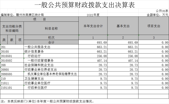 本单位2022年度支出总计693.69万元,其中本年支出合计693.69万元,较2021年减少392.58万元,下降36.1%,主要原因是:2022年减少了人口普查支出;年末结转和结余0万元,较2021年减少94.73万元,增长下降100%,主要原因是:无结转和结余。