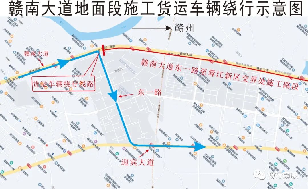 因赣州市中心城区快速路工程建设需要,为确保过往车辆及行人道路交通安全,现决定,2023年7月10日起,南康往赣州方向货运车辆全天候禁止驶入赣南大道与东一路路口至蓉江新区交界处南康往赣州方向半幅路段,过往货运车辆请注意绕行。