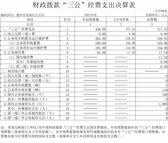 本部门2022年度财政拨款“三公”经费支出全年预算数为 430万元,决算数为277.52万元,完成全年预算的64.53%,决算数较2021年减少133.98万元,下降32.5%,其中: