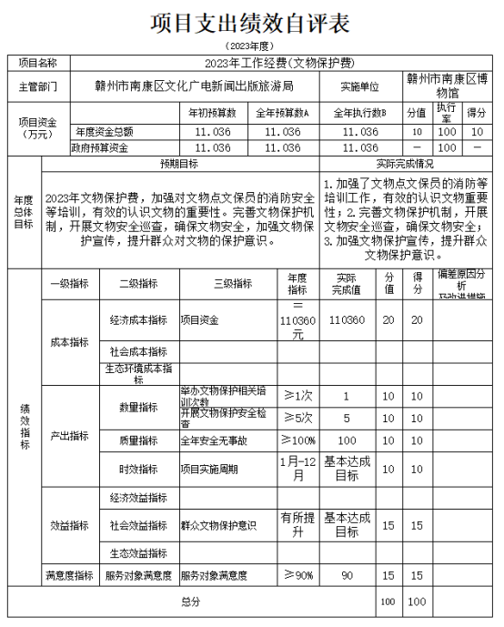 4.本单位“2023年工作经费(文物保护费)项目支出绩效自评表”如下: