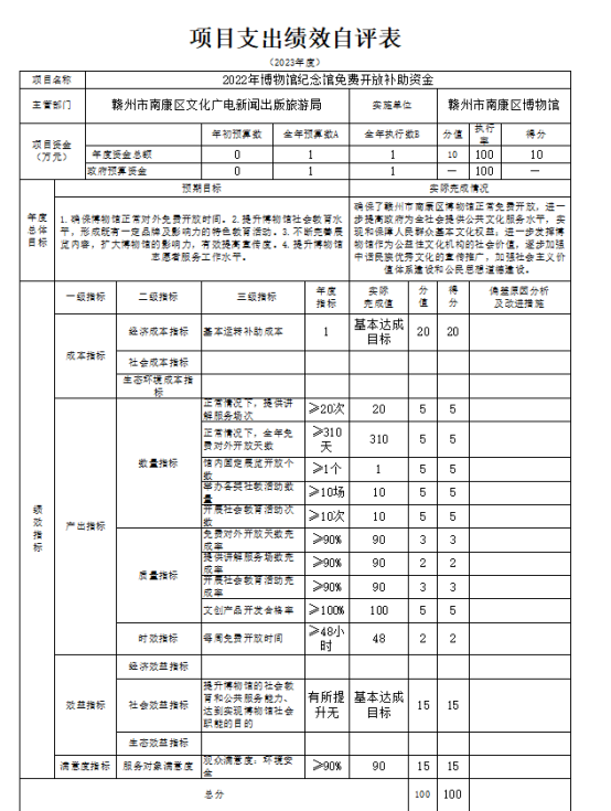 7.本单位“2022年博物馆纪念馆免费开放补助资金项目支出绩效自评表”如下: