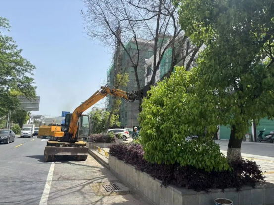 了解到国道旁树枝生长过茂,遮挡视线,存在安全隐患的情况后,立新社区党支部迅速响应,组织施工队开展修枝作业,借助专业设备,对过长树枝精准修剪,消除视觉盲区,守护出行安全。图为修枝作业施工现场。