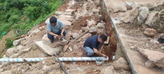 了解到上坳组通组路段因排水系统不畅,导致道路塌方,路基损毁,影响村民生产生活。贤女村党支部迅速行动,积极争取上级支持,将该路段纳入民生工程改造项目。通过科学增设排水管道、高标准修筑16米防护堡坎等工程措施,不仅有效恢复了农田排水功能,更彻底消除了道路安全隐患,切实保障了村民出行安全和生产生活便利。图为施工人员正在紧张有序地进行排水管道铺设作业。