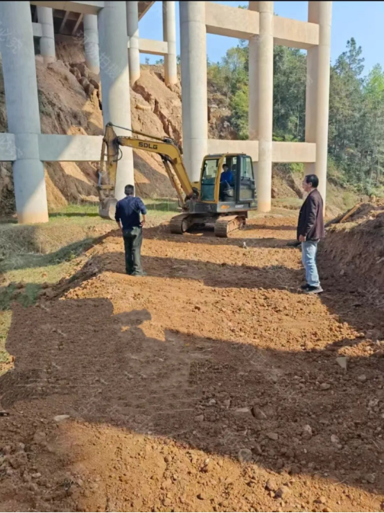 了解到小坑里组焦坑片区因高速公路建设导致15亩水田交通阻断、连续抛荒的问题,赣桥村党支部迅速响应群众诉求,通过实地调研后立即采取有效措施:一方面组织挖掘机修建标准化机耕道恢复农田交通,另一方面积极联系本村种粮大户流转经营。这一举措不仅成功盘活了闲置耕地资源,还建立起"土地流转+务工增收"的双赢机制,让原本荒芜的农田重现生机。如今,新修的机耕道直通田头,大型农机可以自由进出,专业化的规模种植既提高了土地产出效益,又为村民带来了稳定的租金收入和务工机会。图为机耕道施工现场。