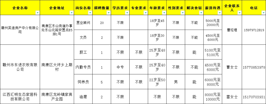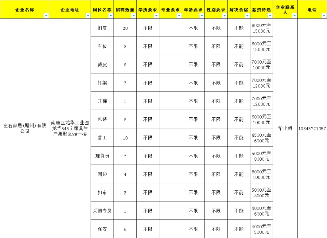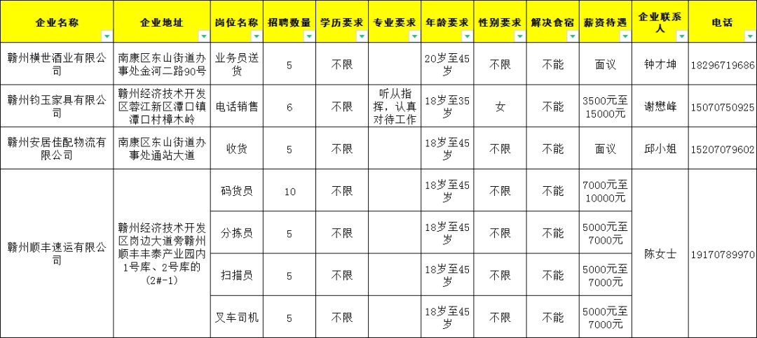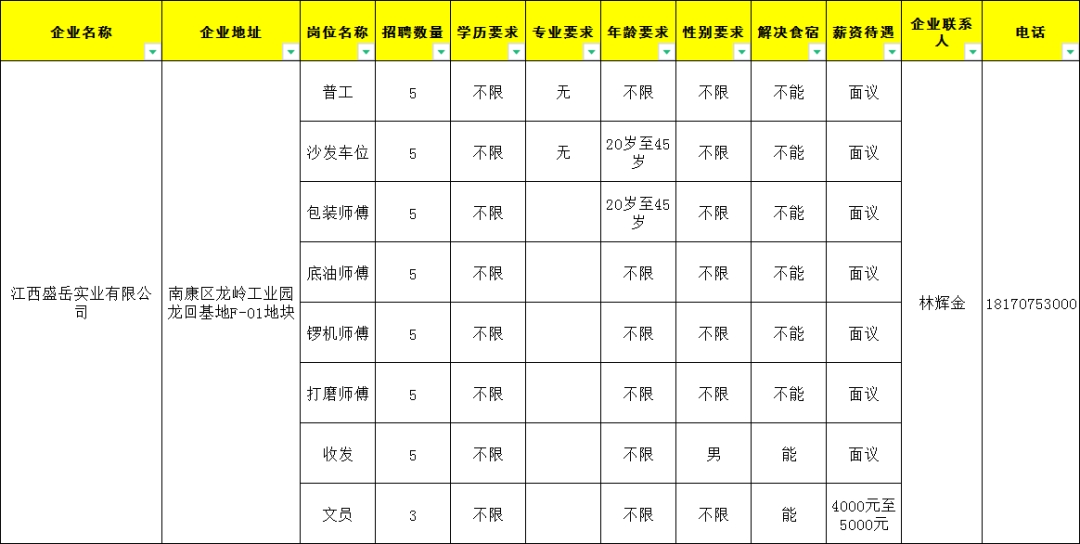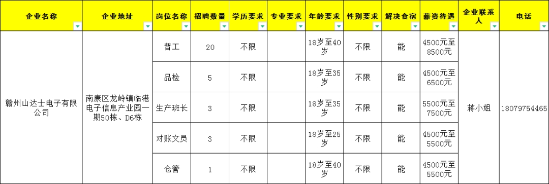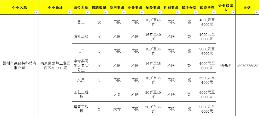 1.普工100人,18岁至45岁,工资4500元至8000元;