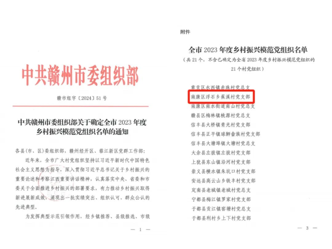 近日,中共赣州市委组织部发文,确定全市2023年度乡村振兴模范党组织名单,浮石乡蕉溪村荣获2023年度赣州市乡村振兴模范党组织!