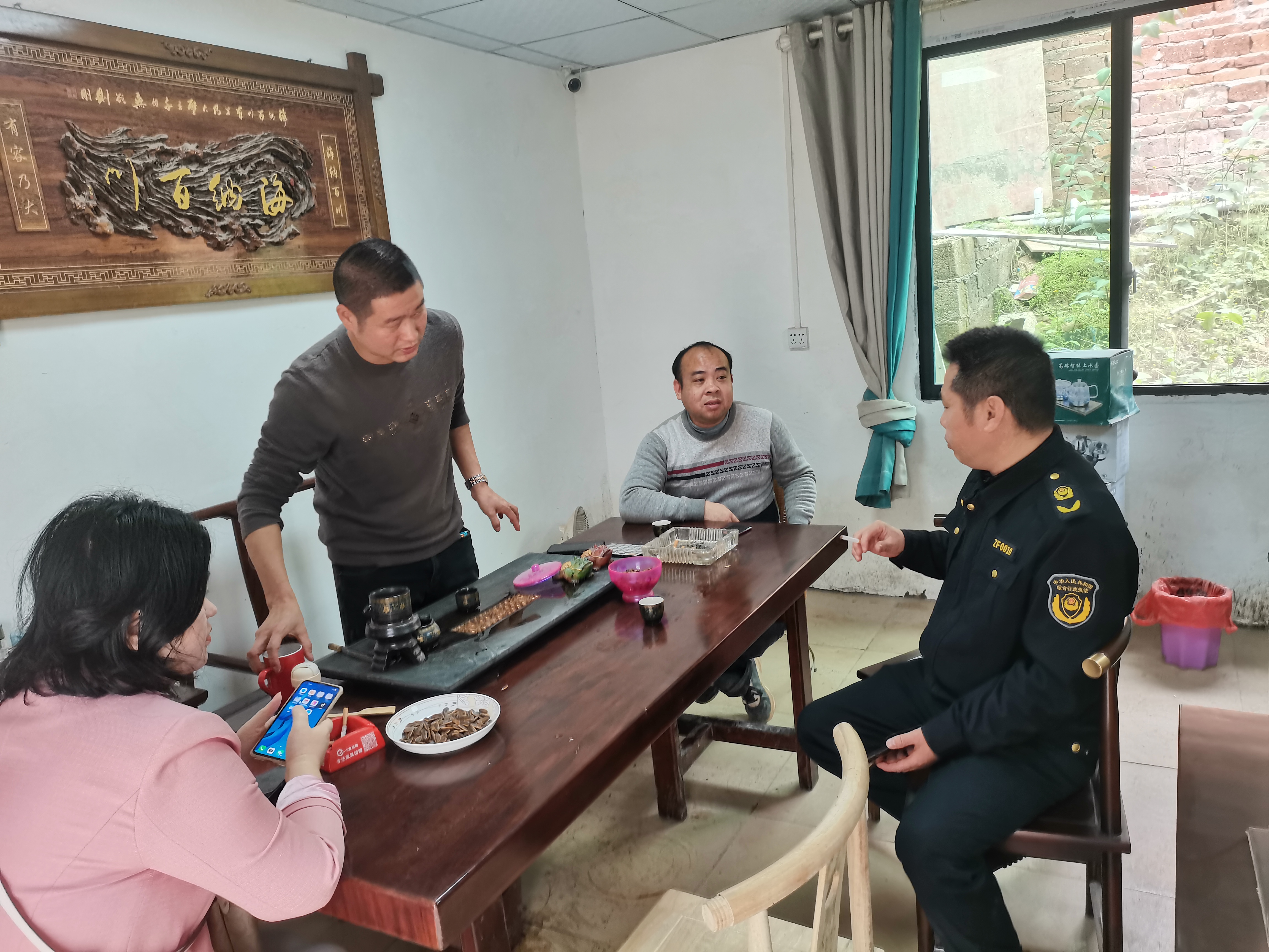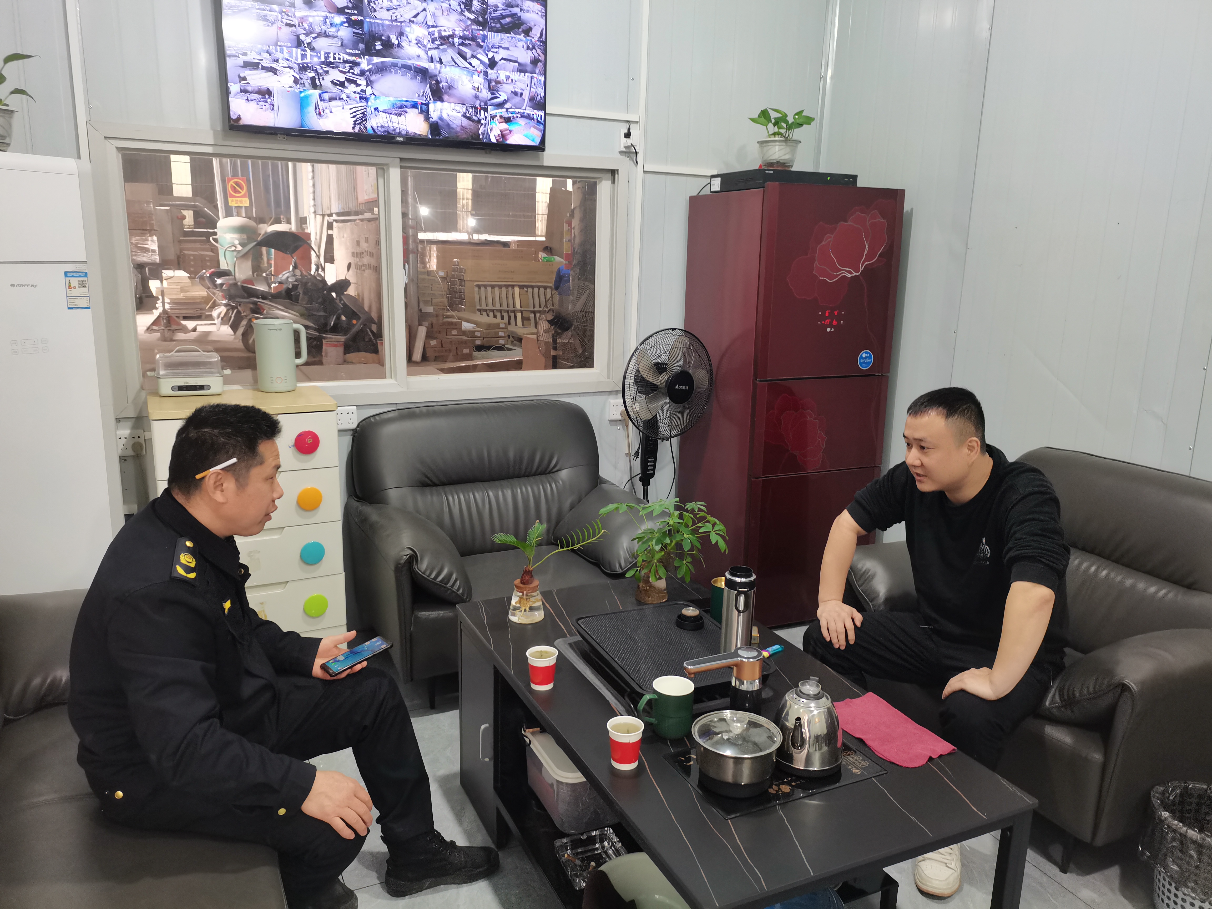 乡执法队员与村环保网格员对辖区内家具厂落实环保建群工作,告知家具厂负责人务必常态化开展环保工作。