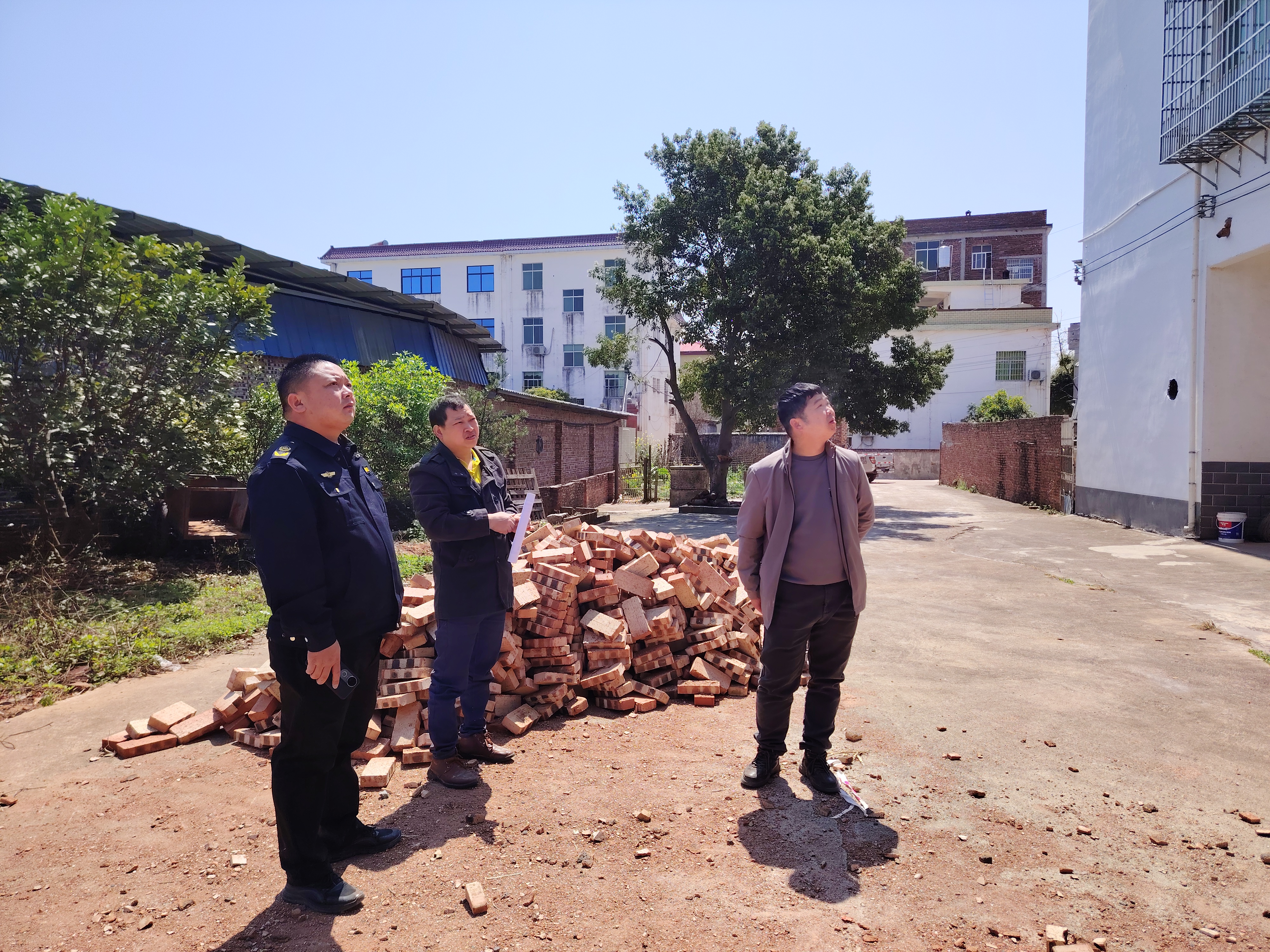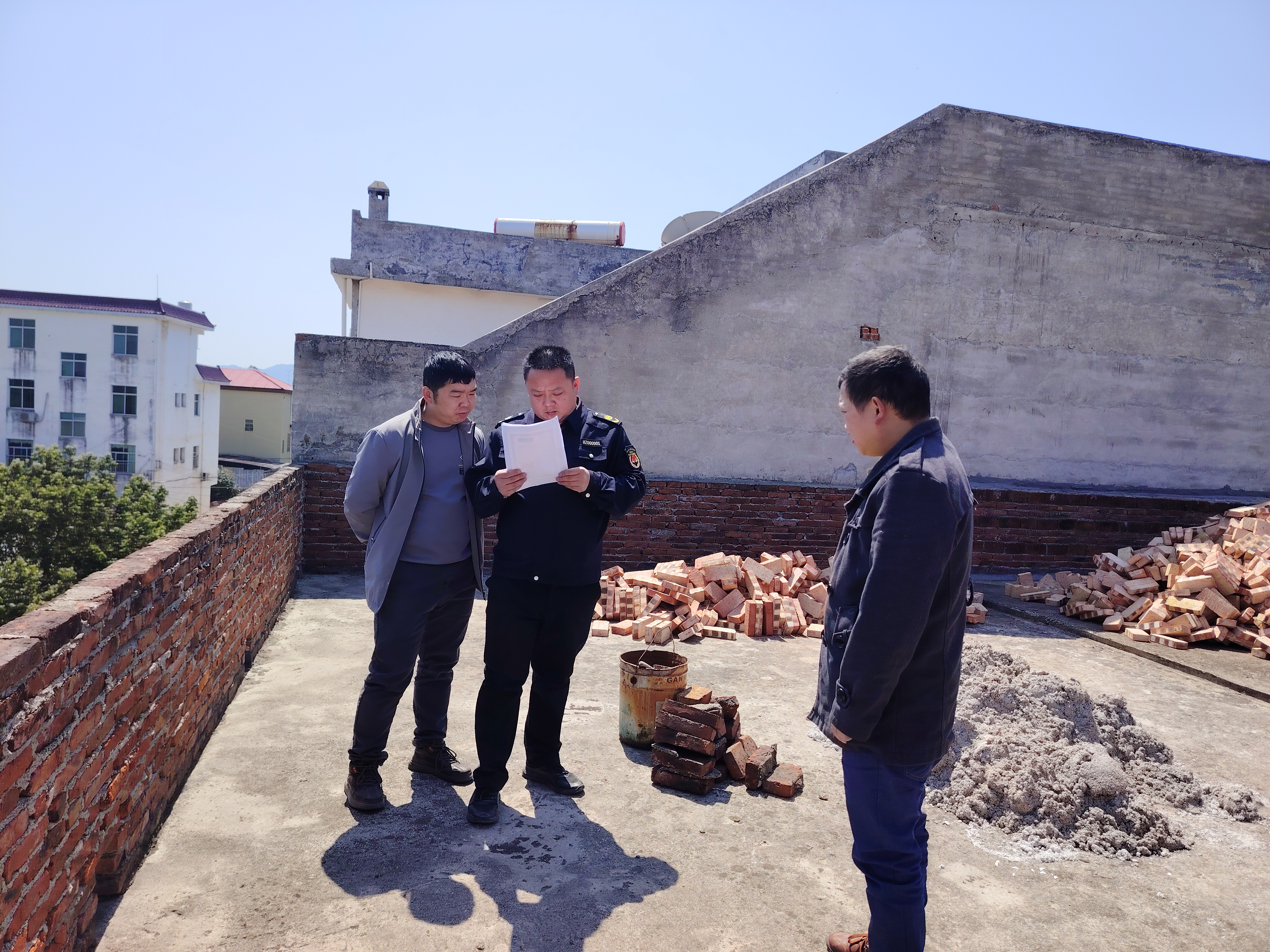 刘队带领执法队员在寨里村踏勘农户农房加层事项