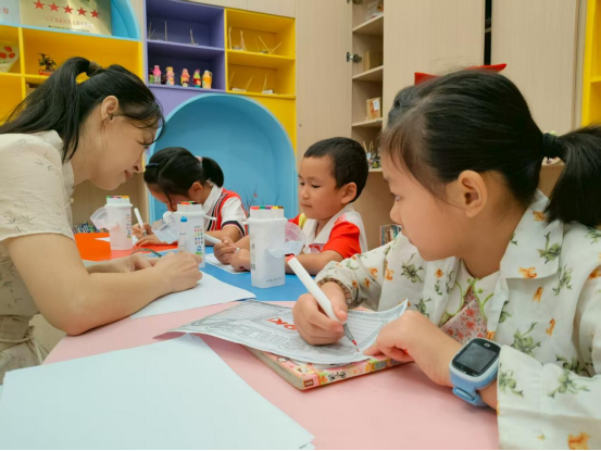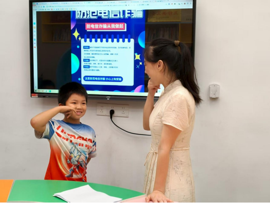 活动中,东梅妈妈用通俗易懂的语言讲解了网络安全的重要性,结合真实案例剖析了常见的电信诈骗手段,如冒充客服、虚假中奖、网络游戏交易诈骗等,并教授了“三不一要”防骗口诀(不轻信、不透露、不转账,要及时报警)。通过和孩子共同演绎情景剧,生动再现了骗子的惯用伎俩和正确的应对方法,现场笑声不断,气氛热烈。最后孩子们围绕“网络安全”“防范电信诈骗”主题进行创作,用画笔和文字表达自己的理解。
