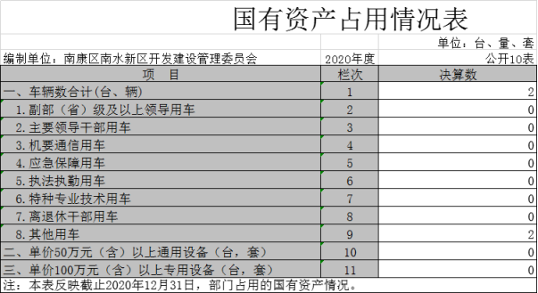 截至2020年12月31日,本部门共有车辆0辆,其中,副部(省)级以上领导干部用车0辆、一般公务用车0辆、一般执法执勤用车0辆、特种专业技术用车0辆、其他用车2 辆;单位价值50万元以上通用设备0台(套),单价100万元以上专用设备0 台(套)。