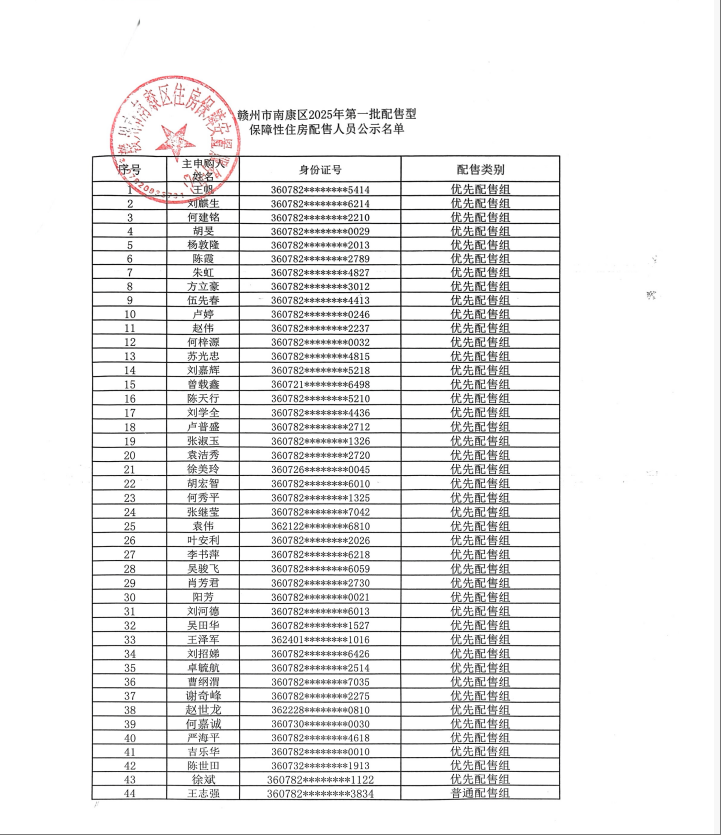 根据《赣州市中心城区配售型保障性住房管理实施细则》、《赣州市南康区佳兴公园配售型保障性住房项目配售方案》、《赣州市南康区龙湖佳兴紫云台配售型保障性住房项目配售方案》等文件精神及相关规定,通过审核家庭共112户。其中,优先配售组家庭43户,普通配售组家庭69户,公示期为5个工作日。公示期间,申请家庭对公示内容有异议的,可线上提交异议复核申请或向区住房中心提交书面申请及佐证材料,其他组织或个人有异议的,须向区住房中心提交书面申请及佐证材料;区住房中心自收到申请之日起8个工作日内,将联合相关部门调查核实并出具异议复核处理结果。公示及异议复核完成后,区住房中心将通过上述线上线下渠道公告最终资格审核结果。公示期间申请家庭成员条件发生变化的,须及时向区住房中心提交书面报告,由区住房中心重新审核。南康区住房保障服务股电话:0797-6795390,邮箱:nkzfbz@163.com。