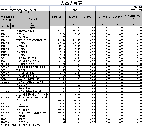 本部门2021年度支出总计 1222.48万元,其中本年支出合计 0万元,较2020年减少303.37946万元,下降30.08 %,主要原因是:项目支出减少,扶贫支出减少,响应上级文件精神,缩减各方面支出,过紧日子;年末结转和结余 0万元,较2020年不变,主要原因是:上级政策要求。