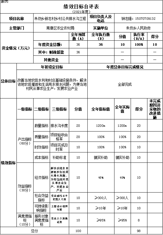 根据预算绩效管理要求,赣州市南康区朱坊乡人民政府组织对朱坊乡新志村乡村公共排水沟工程开展绩效自评,涉及支出36万元。占项目支出总额的100%。