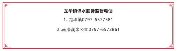 7.当您出现停水(或其他影响您正常用水)问题和发现人为故意破坏供水设施、危害水源时,请您及时拨打供水单位电话、龙华镇供水服务监督电话(附后)、南康区供水服务电话(6799233)或南康区供水服务监督电话(6324365),您也可以关注并使用“赣州农村饮水”小程序(使用教程附后)反映饮水问题,我们会第一时间为您解决。