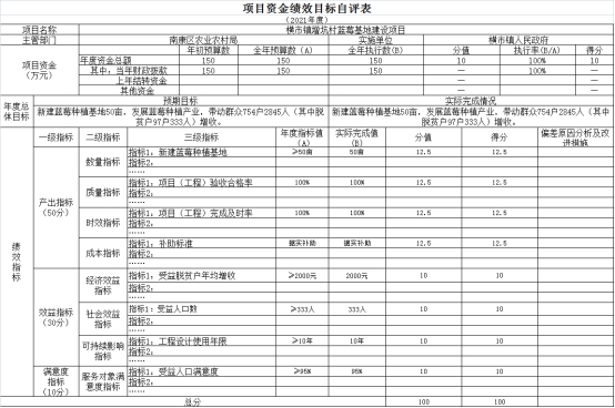 项目绩效自评总体综述:根据年初设定的绩效目标,横市镇增坑村蓝莓基地建设项目绩效自评得分为100分。项目全年预算数为150万元,执行数为150万元,完成预算的100%。项目绩效目标完成情况:建设蓝莓园50亩,带动脱贫户333人实现增收。