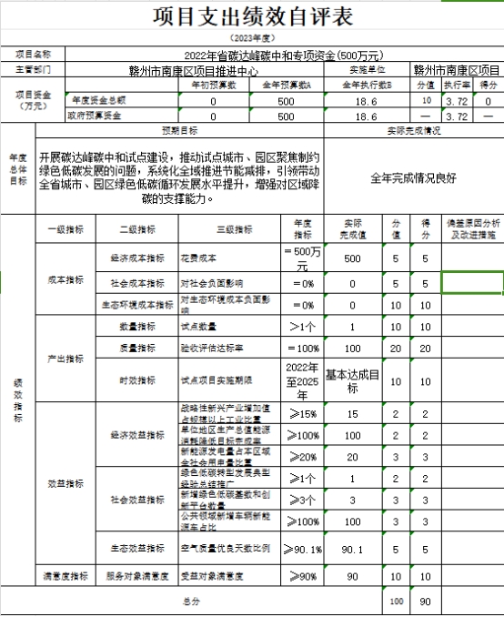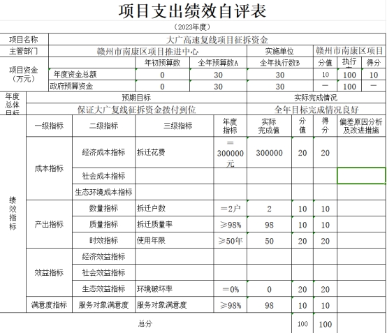 本单位“大广高速复线项目征拆资金”、“2022年省碳达峰碳中和专项资金(500万元)”项目支出绩效自评表如下: