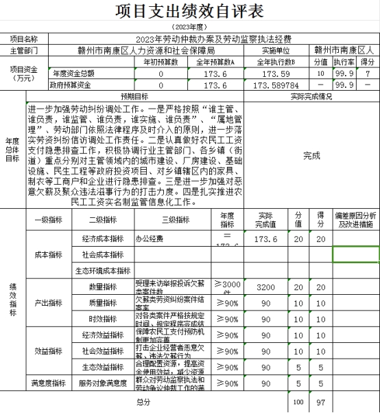 赣州市南康区人力资源和社会保障局(本级)“2023年劳动仲裁办案及劳动监察执法经费项目支出绩效自评表”如下: