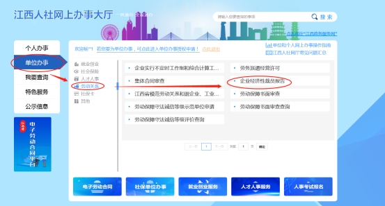 2、如上图所示选择“单位办事”——“劳动关系”——“企业经济性裁员报告”,再点击网上办理,按要求提供申请材料即可。