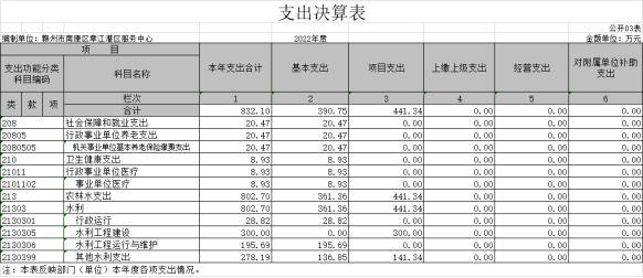 本单位2022年度支出总计832.1万元,其中本年支出合计832.1万元,较2021年减少2118.3万元,下降71.8%,主要原因是:项目工程款支出减少;年末结转和结余0万元,较2021年增加(减少)0万元,增长(下降)0%,主要原因是:资金无结余。