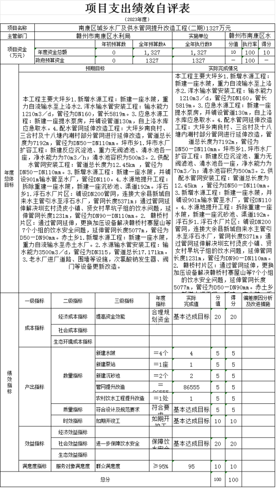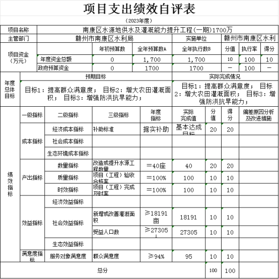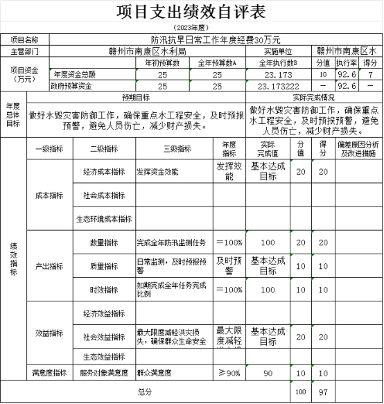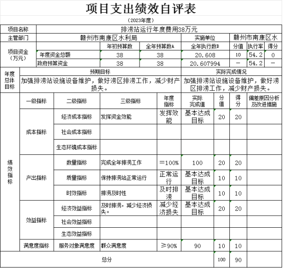 为贯彻落实全面推进预算绩效管理工作的要求,完善部门预算管理,强化预算支出责任,提高财政资金的使用效益,根据《中华人民共和国预算法》、《中共中央国务院关于全面实施预算绩效管理的意见》(中发〔2018〕34 号)及《赣州市南康区财政局关于印发<2020年预算绩效管理工作方案>的通知》文件的要求,我单位积极开展了绩效自评工作,并组成了绩效自评小组,对2023年度排涝站运行绩效进行自评,并形成了绩效自评报告。现报告如下: