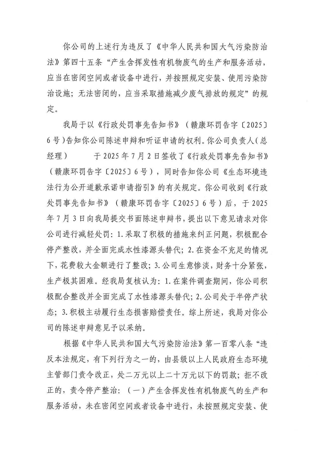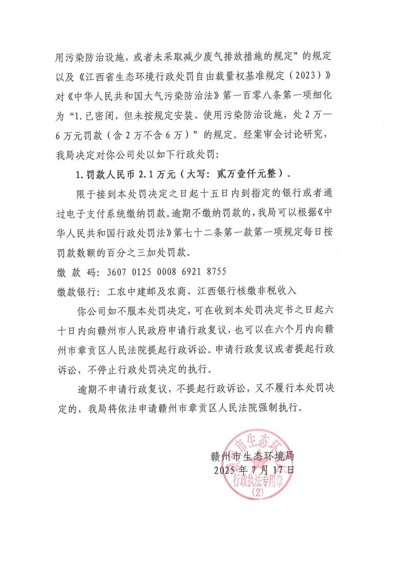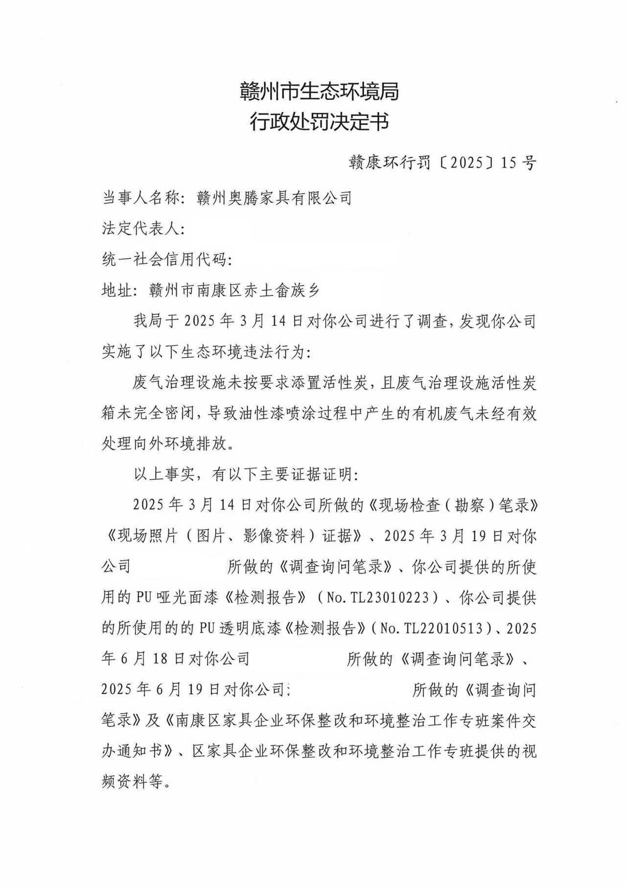 赣州奥腾家具有限公司行政处罚决定书
