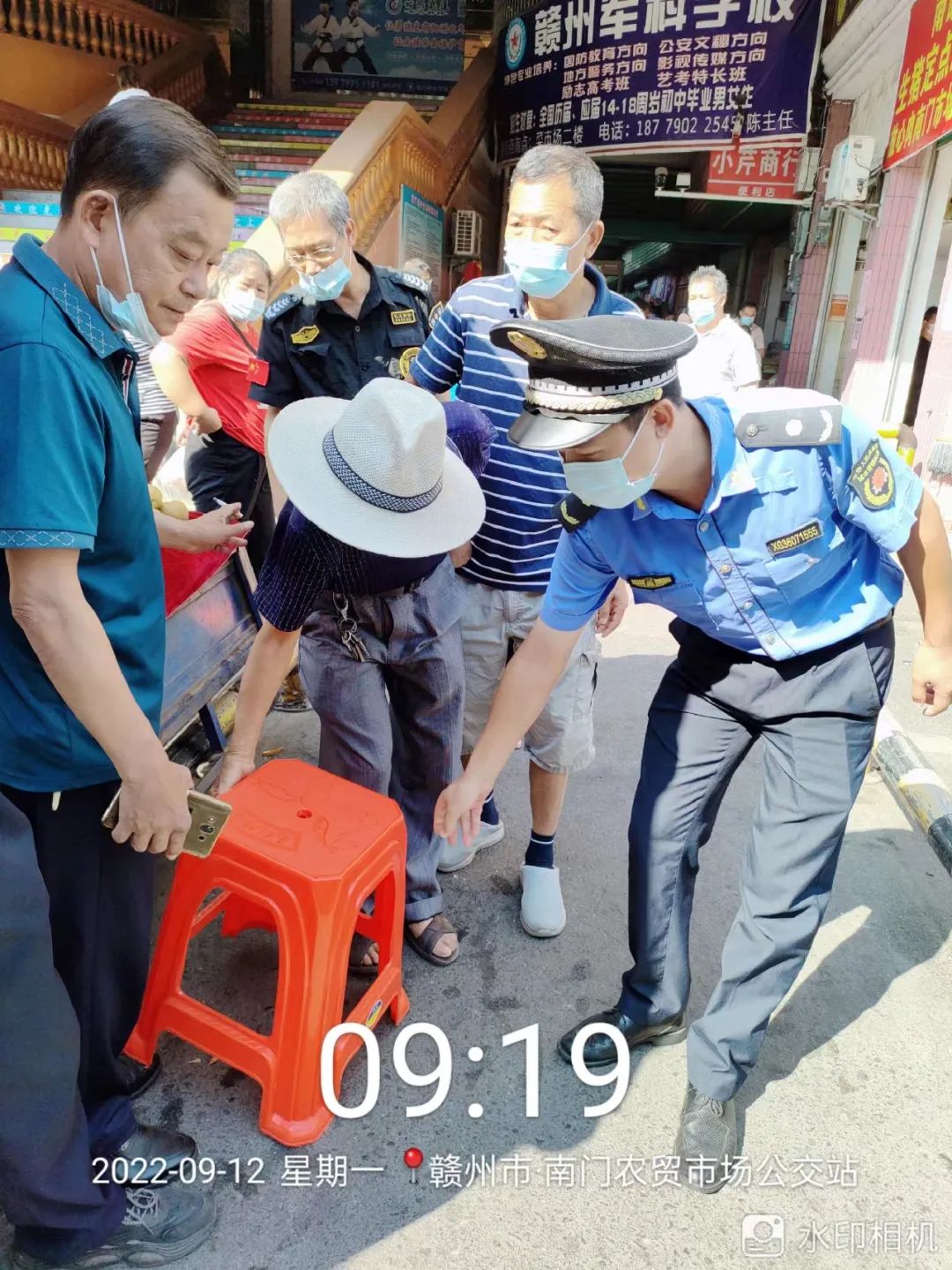 9月12日上午9时,区城管局执法队员在旭山南路南门菜市场大门口处督促商家做好疫情防控工作时,发现一名老人被规范二轮车停放的小栅栏绊倒摔在地上无法起身,脸部被擦伤出血。