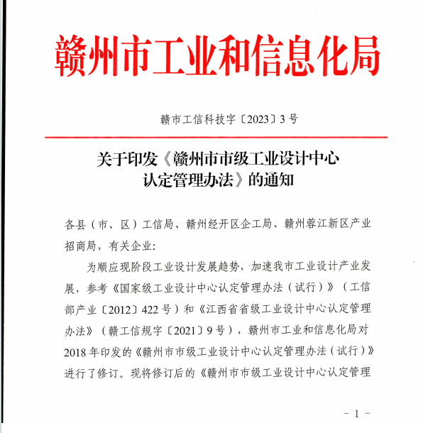 1、(2023.1.5)关于印发《赣州市市级工业设计中心认定管理办法》的通知(赣市工信科技字〔2023〕3号)